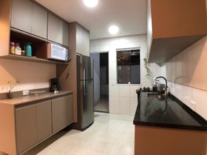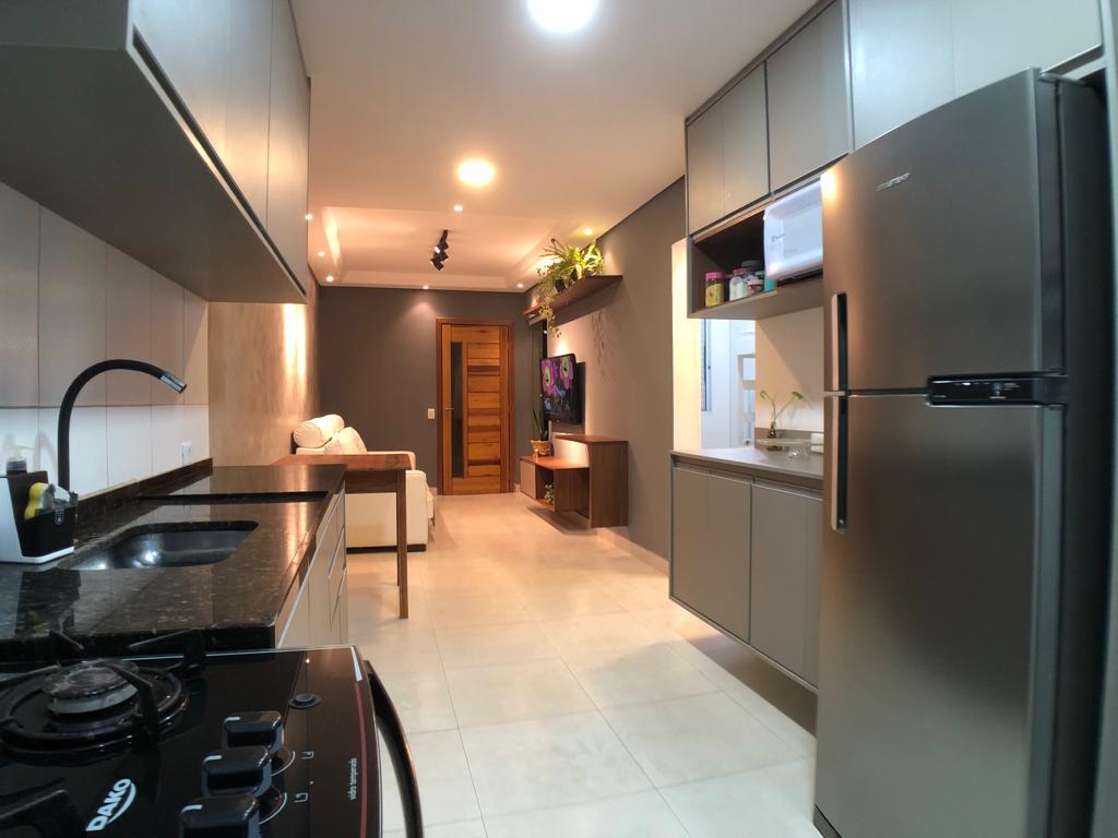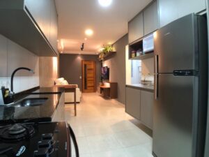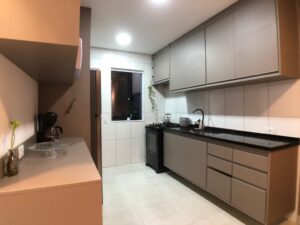 Cozinha planejada com bancada seca em granito.